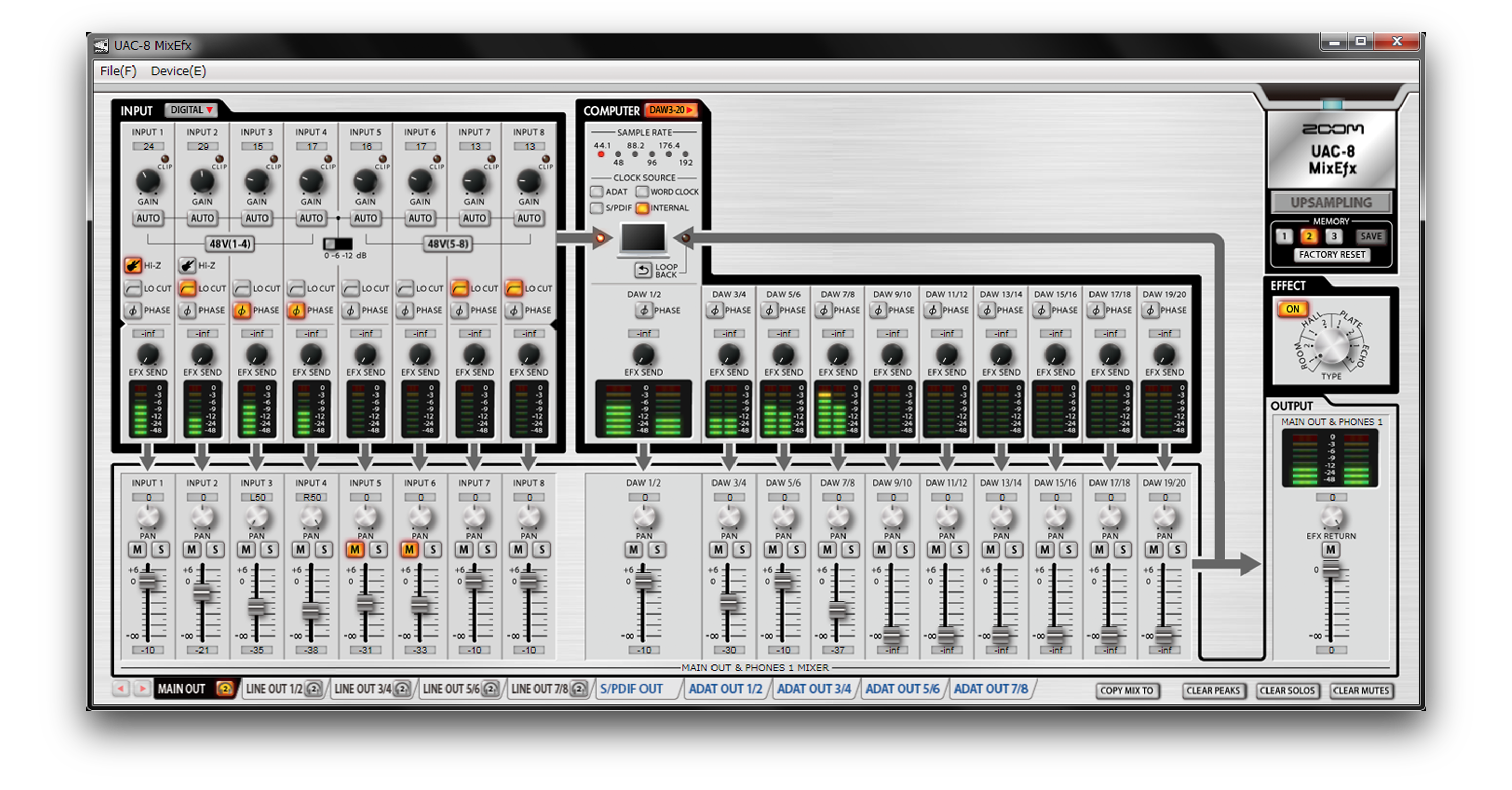 「UAC-8 MixEfx」は、UAC-8専用のミキサーアプリケーションです。コンピュータ上から、入力18チャンネルとコンピュータの再生20チャンネルを、 全20チャンネルの出力に自由にルーティングすることができます。チャンネルごとにゲイン調節、LO-CUT、位相反転、入力レベルを自動的に調節する オートゲイン機能のON/OFF設定が行える他、リバーブ/ディレイなど内蔵DSPで動作する8タイプのモニター用エフェクトや、PC/Macの再生出力を再度コンピュータに送り戻すループバック機能も利用可能。例えばUstreamを行う際に、PC/Mac上の音楽プレイヤーでBGMを再生し、それをバックにマイク/ライン入力をミックスして配信することが可能になります。これらの各種設定をワンタッチで3種類まで保存でき、いつでも瞬時に呼び出すことが可能です。
