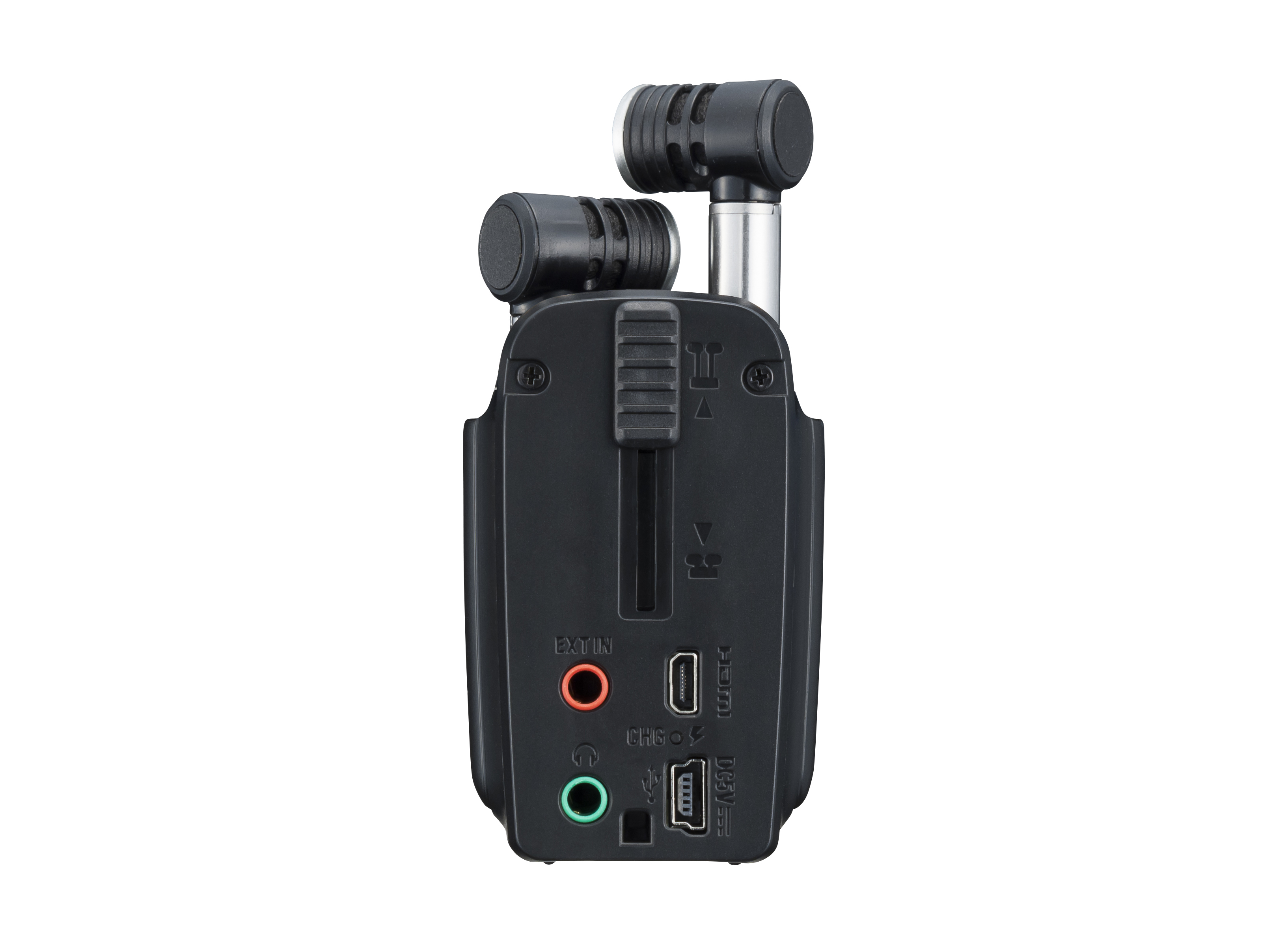 ステレオミニジャックのインプット端子には、外部マイクやオーディオ機器を接続でき、ヘッドフォンまたは内蔵スピーカーで音声をチェックできます。HDMI出力端子を装備しているので、撮影した映像をロケ先やご自宅の大画面テレビに映して鑑賞することもできます。